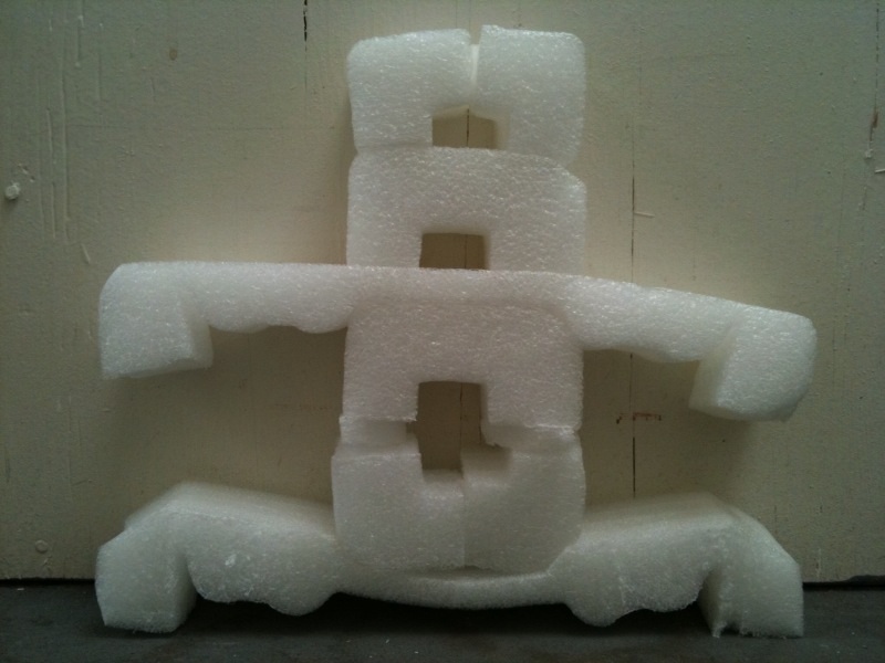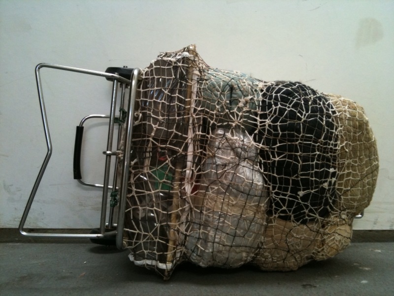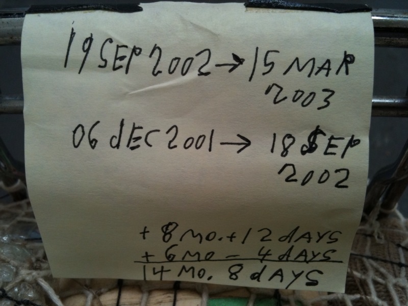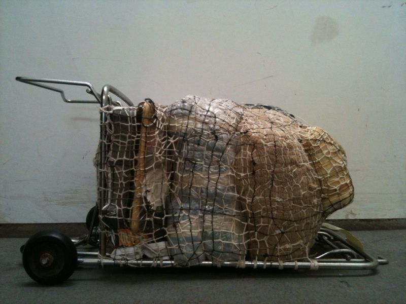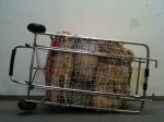 CART, 06 DEC 2001 TO 18 SEP 2002, 19 SEP 2002 TO 15 MAR 2003 (14 MONTHS & 8 DAYS); Spring 2003 and 2013; 20 1/4″x 12 1/4″x 12 1/4″ (with handle not extended); all that might have been refuse (during the dates of the title) generated by me, string, upholstery thread, masking tape, black tape, post-it, ink, white Elastomeric Roof Coating, 2 library card catalog cards (currently located in booklet entitled BNTCFJLXAVO, twist-ties, used hand cart (metal, rubber wheels, plastic handle cover, handle unfolds). EAUTIFUL BEAUTIFUL BEAUTIFUL BEAUTIFUL BEAUTIFUL; fri03:01:58pm27dec2013; used tape, ink; 83×2 inches. I-THINK-I-CAN-I-THINK-I-CAN-CAN-YOU-ALL-MAN-MAN; 08aug2008; 8 pieces of white packing foam; 11×13.5×2 inches.