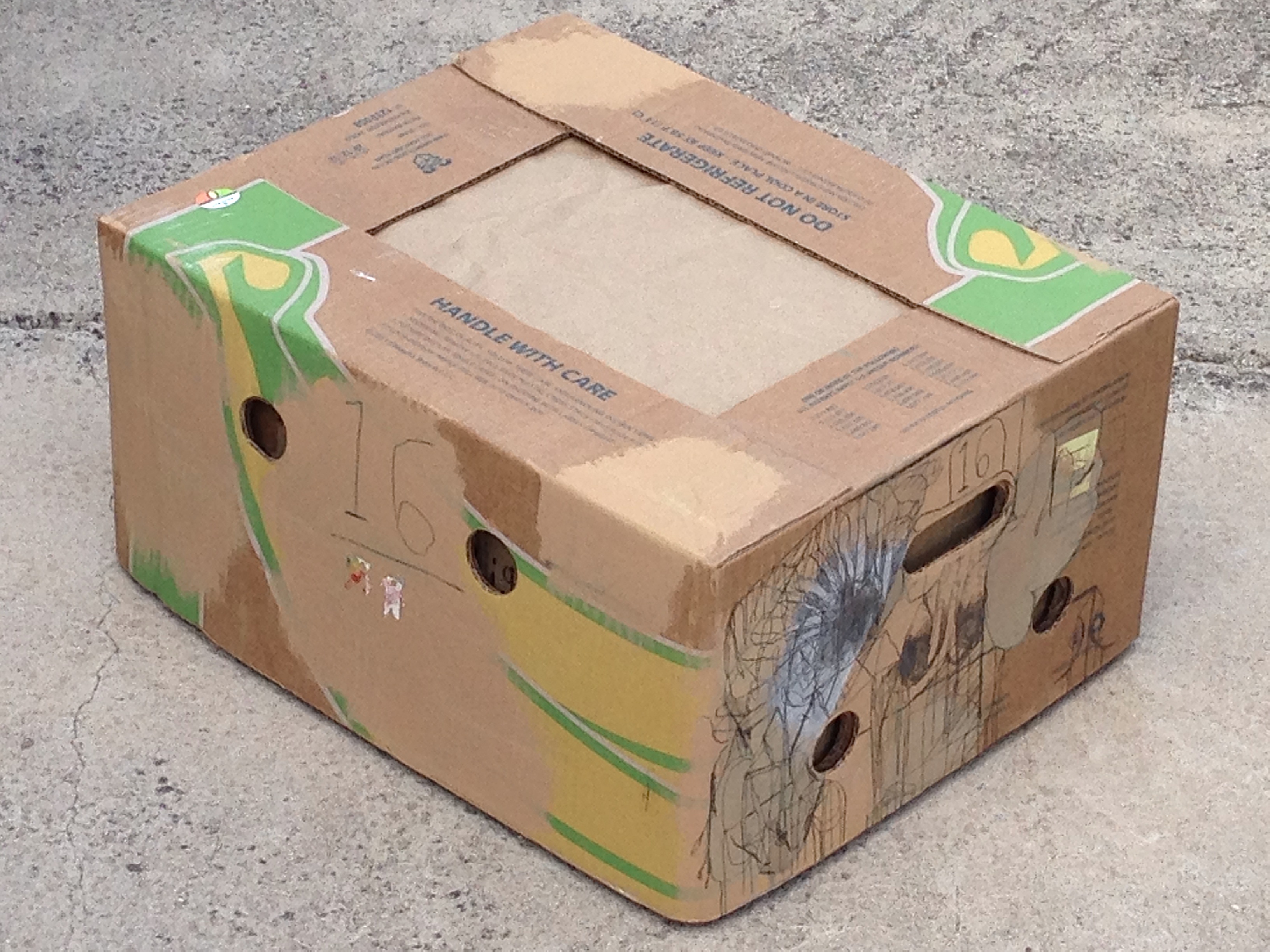 THIS IS MASQUERADERS PACKETTE & DRAWINGS; sun01:53:43pm28oct2007; ink, newsprint, black tape, post-it, black safety pin, string, blue rubberbands around curtain hem weight, Montserrat Masqueraders postcard, misc. paper items; 5x8x2 inches. PANIC CAN SET IN WHEN YOU HAVE A BUYER FOR YOUR HOUSE AND YOU DISCOVER YOUR ROOF LEAKS; tue01:53:41pm23oct2007; ink, graphite, masking tape, found translucent graph paper, list, repair plan (ink, graphite, paper); rubbing made 01oct2005 of kitchen/hall ceiling hole used to determine ceiling drywall replacement piece size, approx 13.5×34.5 inches. BIG BOX, SMALL BOX; 2003-2004; wood, glue, nails, paper, ink, masking tape, string, upholstery thread, duct tape, cardboard; one box is 8.25x8x14.75 inches, the other box is 8×8.5×14.5 inches.