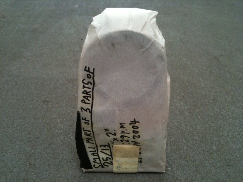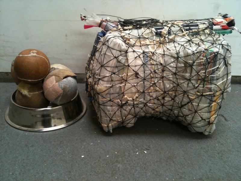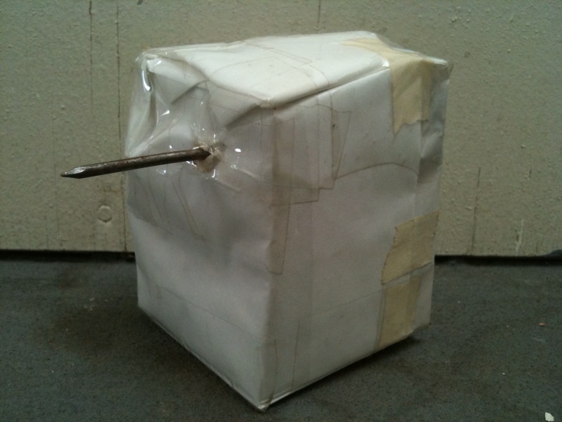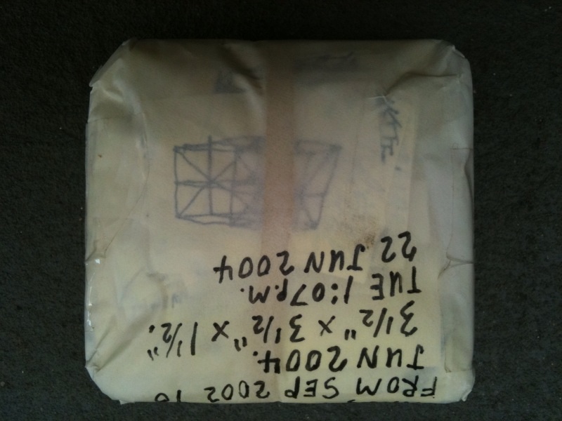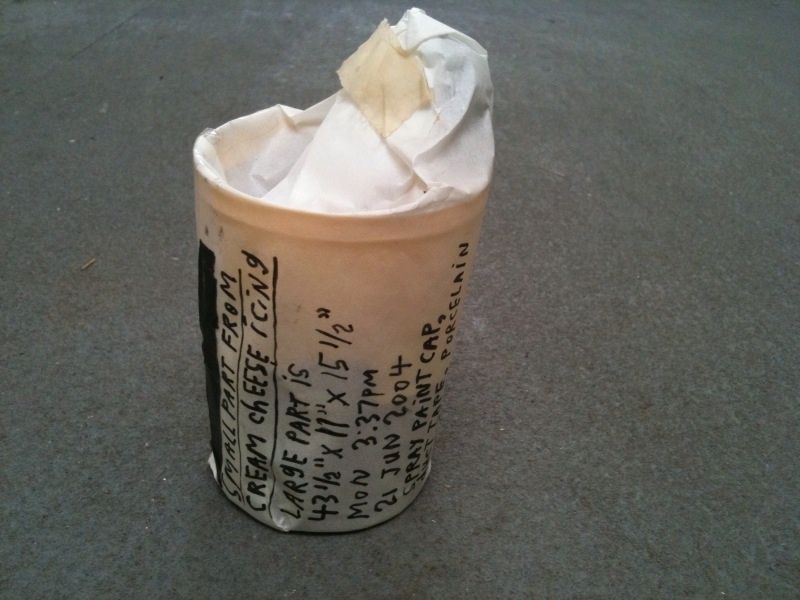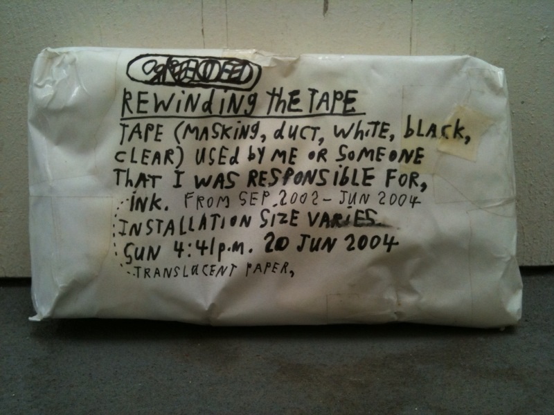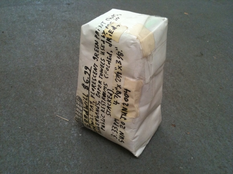 SPOT SPOTS THE SPOT, OR – SPOTTING; DEC 2002; bowl & skinless tennis balls are 5 1/8″x 5 7/8″ diameter, Spot is 7 1/2″x 9 1/2″x 7 1/2″; stainless steel bowl, 5 7 skinless tennis balls I have happened upon, what could have been garbage generated by me and my wife from 23 AUG 2001 to 05 DEC 2001, sisal, upholstery thread, string. A PACK (16 MAR 2003 TO 15 APR 2004); Spring 2004; 8 1/4″x 15″x 13″; all that could have been refuse generated by me from 16 MAR 2003 to 15 APR 2004 (13 months) and 2 post-its, ink, sisal, string, upholstery thread with a tapestry needle attached, masking tape, duct tape. MY B&W TV BIG COLOR TV; 5:15 p.m. THU 24 2004; 2 1/4″x 3 7/8″x 15/16″; ink, clear tape, masking tape, translucent paper, U-shaped nail, 2 small post-its, more ink. Originally interior contents were hung on wall…the U-shaped nail on a found wire hanger tab and post-its with masking tape. (moved to BOX #48) SMALL PART OF 3 PARTS OF 25/13; 21 JUN 2004; 5″x 3″x 1 1/4″; clear & black & masking tape, ink, paper, cardboard ring, other. (moved to BOX #52) SMALL PART FROM CREAM CHEESE ICING; MON 3:37 p.m. 21 JUN 2004; 5″x 2 7/8″ diameter; spray paint cap, porcelain touch-up (light avocado), duct tape, translucent paper, ink, black & clear & masking tape. (moved to BOX #43) TABLE LEG FOOT TOE PIECES 3 EA.; 10:57 a.m. WED 23 JUN 2004; 2 1/2″x 2″x 2 3/4″; table leg foot toe pieces (3 ea.), black tape, masking tape, translucent paper, ink. (moved to BOX #42) NOTES, POST-IT; TUE 1:07 p.m. 22 JUN 2004; 3 1/2″x 3 1/2″x 1 1/2″; clear tape, masking tape, ink, translucent paper, duct tape, a rubberband, post-it notes from SEP 2002 to JUN 2004. (moved to BOX #48) UNTITLED (WOOD, NAILS, RUBBERBANDS); SUN 3:08 p.m. 20 JUN 2004; 2 3/4″x 4 3/4″x 4; wood, nails, rubberbands. (moved to BOX #43) BROKEN READING GLASSES (see BOX #33) (moved to BOX #55) REWINDING THE TAPE; SUN 4:41 p.m. 20 JUN 2004; tape (masking, duct, white, black, clear) used by me or someone(s) that I was responsible for, ink, paper (translucent). (moved to BOX #52) GOODWILL $6.99; SUN 3:33 p.m. 20 JUN 2004; 4 7/8″x 2 7/8″x 3 1/8″; Goodwill tag, florescent green paint chips, rubberbands, paper towels used by me in public restrooms (folded, dried, stacked), ink, masking tape, clear tape, translucent paper. (moved to BOX #51) I HARDLY EVEN KNEW HER (see BOX #58) 10 – 6 = 4; sat09:47:11pm07jul2012; string, 6 empty bottles of colored inks, ink (the color of 10 partial bottles of different colored inks mixed together) (the total ink of all 10 partial bottles was combined & mixed then poured into the empty bottles till it ran out which filled 4 bottles); 5″x3″x3″x3″. A STAINED TOWEL WITH A HOLE IN IT; sat10:21:11pm07jul2012; a cotton towel, dirt, paint; 15″x17″ (flat).
