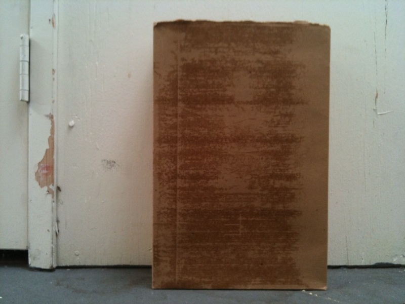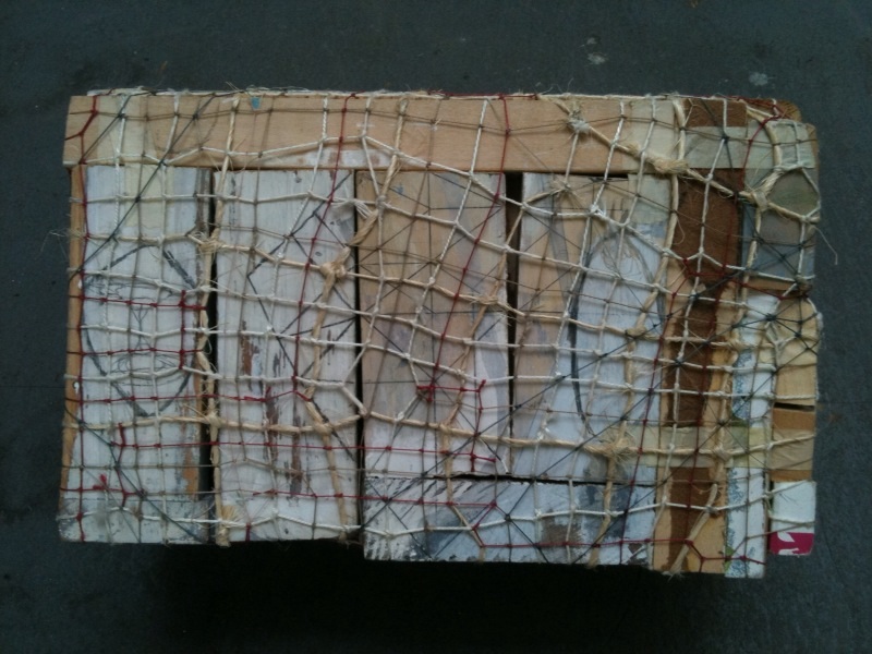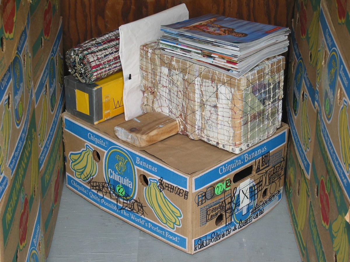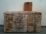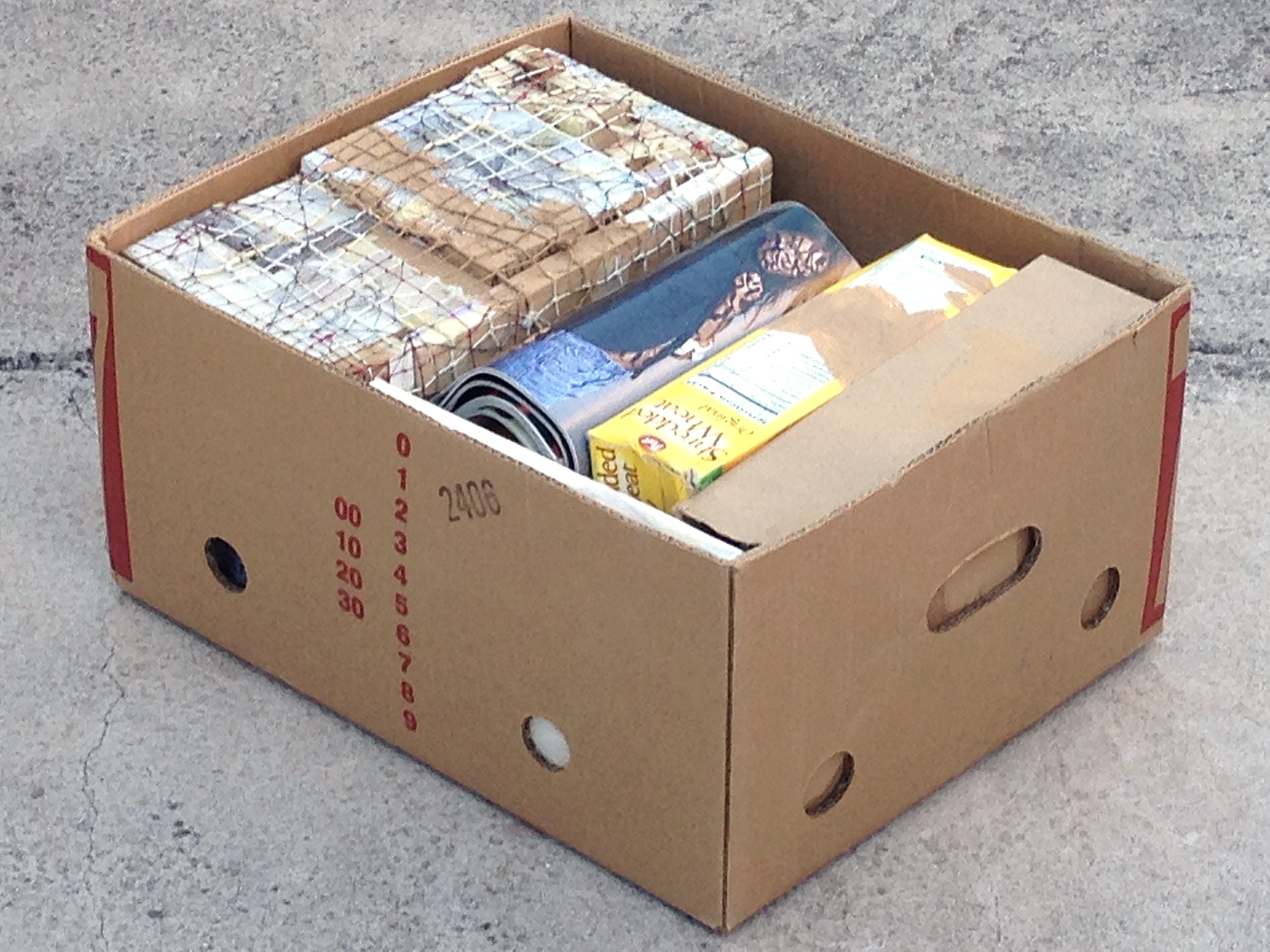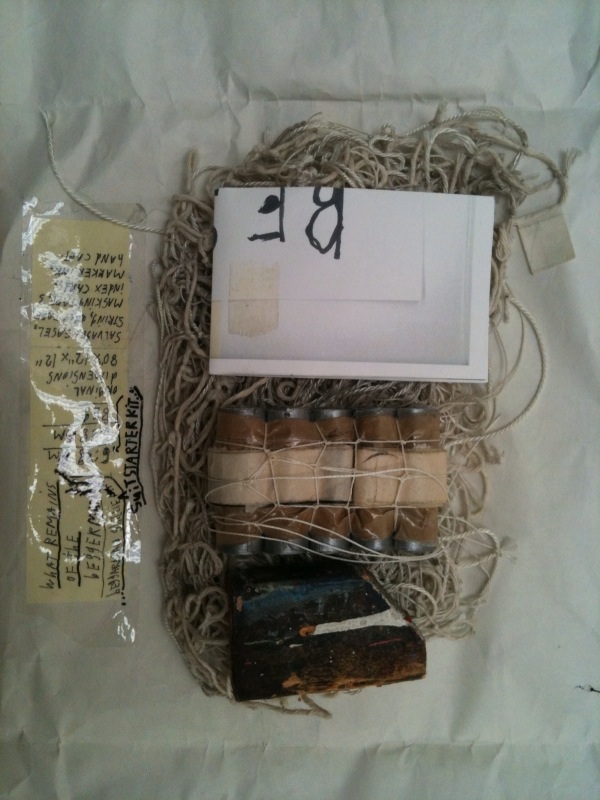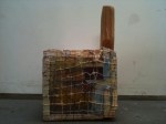 PURPLE TISSUE PAPER WITH SOMETHING IN IT (see BOX #48) A SHREDDED WHEAT BOX FULL OF MORE PROUD AMERICANS IN OUR STRUGGLE TO PROTECT THE HOMELAND (see BOX #48) HORIZONTALS & VERTICALS; 2004; 13 1/4″x 14 1/4″x 8 1/2″; 2 (bad) acrylic paintings, from 2000, on wood, reconfigured into 1 sculpture; tapestry needle, upholstery thread, nylon string, sisal, graphite, acrylic, masking tape, 10 screws, 2 L-shaped metal braces. WHAT REMAINS OF THE BEGGERMAN…BEGGERMAN GHILLIE SUIT STARTER KIT…6:38 P.M. 6:38 A.M. BEG; fully dissembled Spring/Summer 2006 into current size, 10 3/4″x 10 1/8″x 1 1/4″ (closed), ink, black tape, newsprint & 28 1/4″x 29 1/2″x 1 1/4″ (open), newsprint, ink, yellow post-its, clear tape, cotton & nylon string, upholstery thread, wood block with paint, masking tape, brown tape, 100 MPH tape, color photocopy. In 2002 I happened upon a heavy wooden easel in a big trash dumpster…it was missing a couple of small parts. I salvaged it thinking I’d repair it and return it to the world of painters. It took up too much of my space so I dissembled it and stacked the heavy paint-stained wood parts, then propped it up in a corner…it stood there 80″x 12″x 4″ or so…hard quiet elongated figure…this reminded me of a seemingly homeless man that I ocassionally saw in NYC that silently begged at the NJ Path Train stations between Christopher St. and 34th St…he wore a faded red puffy down jacket…every few weeks I’d see him and each time I’d see him he’d be thinner..the last time I saw him it looked like a jacket hovering empty without him…he had disappeared…I never got around to fixing the easel and I got used to it as the beggerman…I noticed on my digital clock that at 6:38, if you read it upside-down, it reads “Beg”…so, the beggerman begged in 12-hour shifts…6:38 a.m. to 6:38 p.m. and so on…I sturdied him up with a little tape and some string tieing…then 1 day I decided to let him go…so, I cut him loose, loaded him into my Corolla and took him back to his dumpster…and threw him in…and, so…this is what remains of the beggerman. One day, if I’m brave enough, I will put the wood block and tape cartridge in my belt and I will drape the rest over me and disappear. WIRY SECTION; Spring 2004; box is 13 7/8″x 4 1/2″x 4 1/2″ and 12″x 4 1/2” diameter is the other; box is a cut-down photo paper box with ink and clear & duct tape…the other is various wires, string, upholstery thread. MORE PROUD AMERICANS SERVE STRUGGLE TO PROTECT HOMELAND; ongoing since 2006; paper, ink, tape; fits inside large powdered milk box. 28 MORE PROUD AMERICANS SERVE STRUGGLE TO PROTECT HOMELAND; thu09:26:25pm23jul2015 (part of larger artwork ongoing since 2006); paper (aug2015 J. Crew style guide), ink (Sharpie) 10x8x.25 inches. 31 MORE PROUD AMERICANS SERVE STRUGGLE TO PROTECT HOMELAND; tue10:09:42pm18aug2015 (part of larger ongoing patriotic artwork since 2006) ; paper (sep2015 J. Crew style guide), ink (Sharpie) 10x8x.25 inches. 24 MORE PROUD AMERICANS SERVE STRUGGLE TO PROTECT HOMELAND; wed09:19:41pm23sep2015 (part of larger ongoing patriotic artwork since 2006) ; paper (oct2015 J. Crew style guide), ink (Sharpie) 10x8x.25 inches. 21 MORE PROUD AMERICANS SERVE STRUGGLE TO PROTECT HOMELAND; fri10:33:05pm23oct2015 (part of larger ongoing patriotic artwork since 2006) ; paper (nov2015 J. Crew style guide), ink (Sharpie) 10x8x.25 inches.