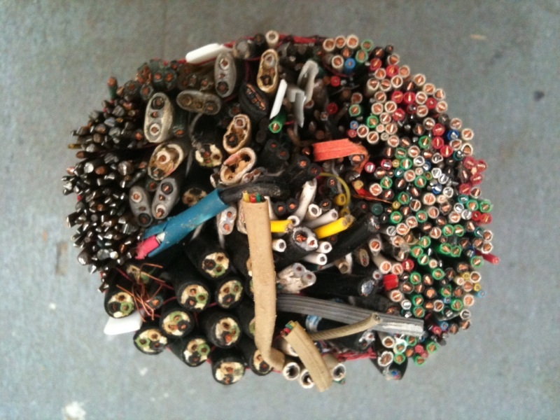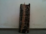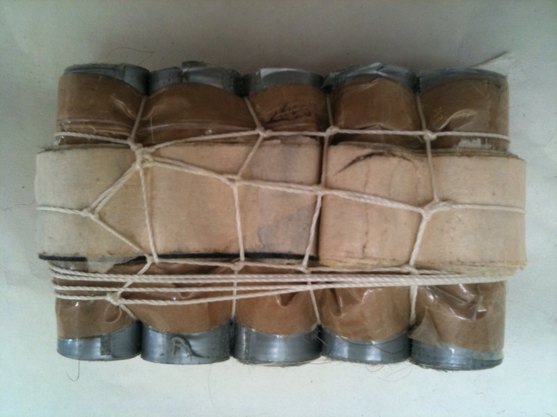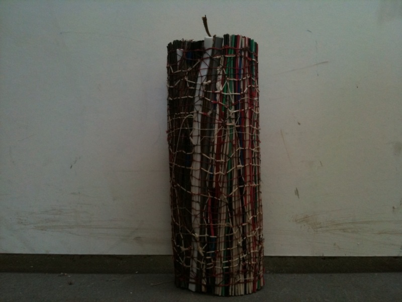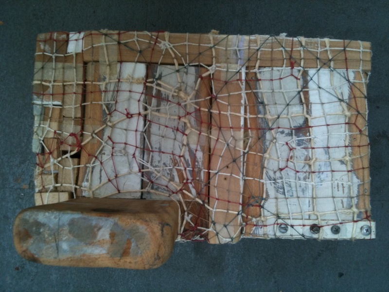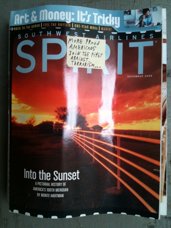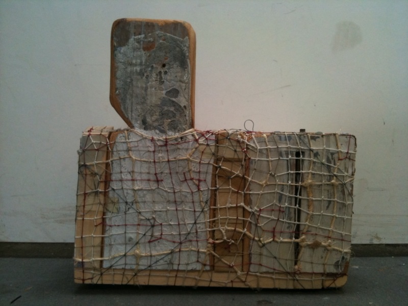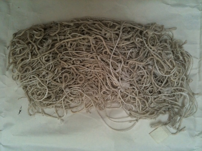 PURPLE TISSUE PAPER WITH SOMETHING IN IT (see BOX #48) A SHREDDED WHEAT BOX FULL OF MORE PROUD AMERICANS IN OUR STRUGGLE TO PROTECT THE HOMELAND (see BOX #48) HORIZONTALS & VERTICALS; 2004; 13 1/4″x 14 1/4″x 8 1/2″; 2 (bad) acrylic paintings, from 2000, on wood, reconfigured into 1 sculpture; tapestry needle, upholstery thread, nylon string, sisal, graphite, acrylic, masking tape, 10 screws, 2 L-shaped metal braces. WHAT REMAINS OF THE BEGGERMAN…BEGGERMAN GHILLIE SUIT STARTER KIT…6:38 P.M. 6:38 A.M. BEG; fully dissembled Spring/Summer 2006 into current size, 10 3/4″x 10 1/8″x 1 1/4″ (closed), ink, black tape, newsprint & 28 1/4″x 29 1/2″x 1 1/4″ (open), newsprint, ink, yellow post-its, clear tape, cotton & nylon string, upholstery thread, wood block with paint, masking tape, brown tape, 100 MPH tape, color photocopy. In 2002 I happened upon a heavy wooden easel in a big trash dumpster…it was missing a couple of small parts. I salvaged it thinking I’d repair it and return it to the world of painters. It took up too much of my space so I dissembled it and stacked the heavy paint-stained wood parts, then propped it up in a corner…it stood there 80″x 12″x 4″ or so…hard quiet elongated figure…this reminded me of a seemingly homeless man that I ocassionally saw in NYC that silently begged at the NJ Path Train stations between Christopher St. and 34th St…he wore a faded red puffy down jacket…every few weeks I’d see him and each time I’d see him he’d be thinner..the last time I saw him it looked like a jacket hovering empty without him…he had disappeared…I never got around to fixing the easel and I got used to it as the beggerman…I noticed on my digital clock that at 6:38, if you read it upside-down, it reads “Beg”…so, the beggerman begged in 12-hour shifts…6:38 a.m. to 6:38 p.m. and so on…I sturdied him up with a little tape and some string tieing…then 1 day I decided to let him go…so, I cut him loose, loaded him into my Corolla and took him back to his dumpster…and threw him in…and, so…this is what remains of the beggerman. One day, if I’m brave enough, I will put the wood block and tape cartridge in my belt and I will drape the rest over me and disappear. WIRY SECTION; Spring 2004; box is 13 7/8″x 4 1/2″x 4 1/2″ and 12″x 4 1/2” diameter is the other; box is a cut-down photo paper box with ink and clear & duct tape…the other is various wires, string, upholstery thread. MORE PROUD AMERICANS SERVE STRUGGLE TO PROTECT HOMELAND; ongoing since 2006; paper, ink, tape; fits inside large powdered milk box. 28 MORE PROUD AMERICANS SERVE STRUGGLE TO PROTECT HOMELAND; thu09:26:25pm23jul2015 (part of larger artwork ongoing since 2006); paper (aug2015 J. Crew style guide), ink (Sharpie) 10x8x.25 inches. 31 MORE PROUD AMERICANS SERVE STRUGGLE TO PROTECT HOMELAND; tue10:09:42pm18aug2015 (part of larger ongoing patriotic artwork since 2006) ; paper (sep2015 J. Crew style guide), ink (Sharpie) 10x8x.25 inches. 24 MORE PROUD AMERICANS SERVE STRUGGLE TO PROTECT HOMELAND; wed09:19:41pm23sep2015 (part of larger ongoing patriotic artwork since 2006) ; paper (oct2015 J. Crew style guide), ink (Sharpie) 10x8x.25 inches. 21 MORE PROUD AMERICANS SERVE STRUGGLE TO PROTECT HOMELAND; fri10:33:05pm23oct2015 (part of larger ongoing patriotic artwork since 2006) ; paper (nov2015 J. Crew style guide), ink (Sharpie) 10x8x.25 inches.
