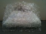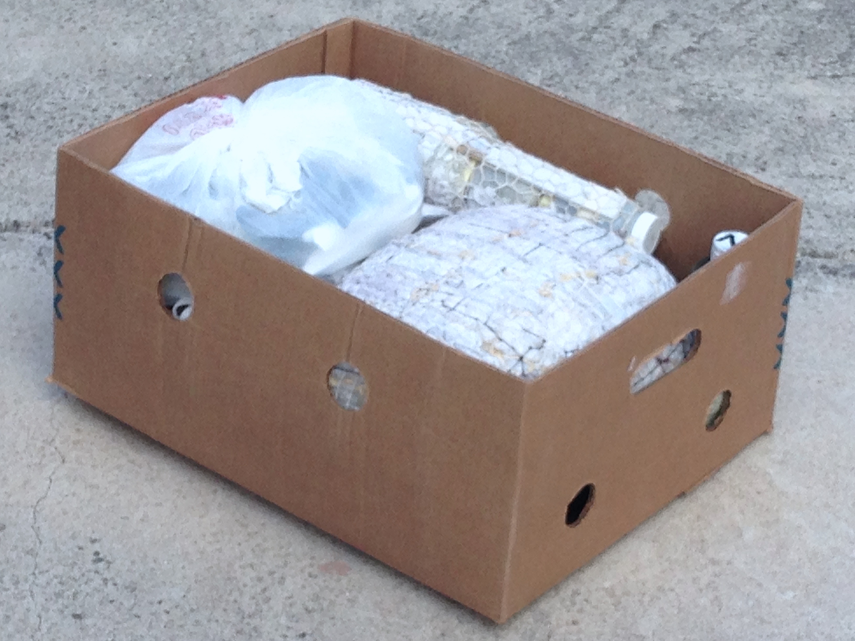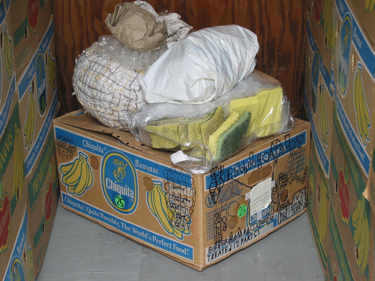 CONFORMS TO ASTM D4236; mon11:11:11pm09jul2012; string, masking tape, 2 paint stirsticks, 4 containers (3 plastic, 1 glass with a metal cap) containing certain varied amounts of acrylic matte and/or gloss mediums, a plastic ziploc bag; 13″x4″ diameter. 3 OF 6 ALL COMBINED & MIXED THEN DIVIDED INTO 27 EQUAL PARTS THEN 1/2 OF EACH POURED INTO EACH OF THE TOTAL 54 BOXES; wed06:43:02pm11jul2012; masking tape, plastic, paper, ink, traces of tempera paint; 7″x2 3/4″ diameter. 31 SPONGES + 14 MORE; 31 SPONGES, Spring/Summer 2004 & + 14 MORE, since then; 31 SPONGES is approximately 15 1/4″x 8 1/4″x 5 1/2″ and + 14 MORE varies; 31 SPONGES is 30 used sponges & 1 unused sponge, + 14 MORE is 11 used sponges & 3 unused sponges. HERE COMES THE…; NOV 2006; 8 1/2″x 13″x 11 1/2″; sisal, string, clear tape, various plastics, 3 handmade wedding pillows, 2 stuffed bride & groom Teddy Bears with porcelain faces, post-it, ink. FAST FOOD FORKS & MORE; ongoing; approximately 5″x 12″x 8″; used fast food eating utensils (pretty much all of which were not asked for) and more plastic eating utensils salvaged from social events, 2 plastic bags. FOUND FISHERMAN’S FLOAT; 1999; a sphere 4″ in diameter; glass, twine/rope. (moved to BOX #24)