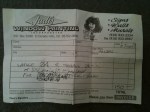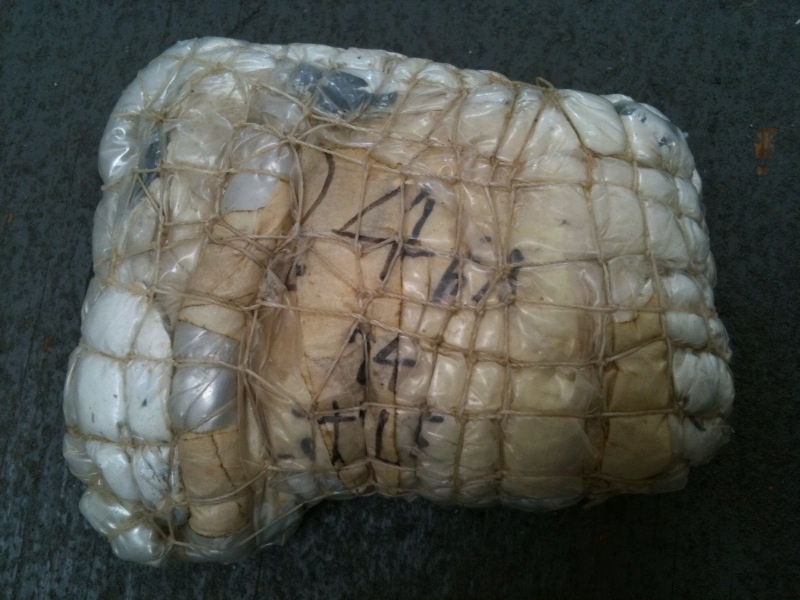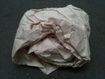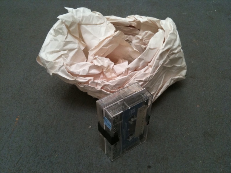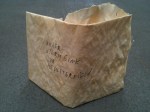 2 OF 6 ALL COMBINED & MIXED THEN DIVIDED INTO 27 EQUAL PARTS THEN 1/2 OF EACH POURED INTO EACH OF THE CURRENT TOTAL 54 BOXES; wed06:27:02pm11jul2012; plastic, paper, ink, traces of tempera paint; 7 1/8″x2 3/4″ diameter. AT SOME POINT POUND THIS WITH A HAMMER BUT NOT NOW; wed98:37:42am11jul2012; string, oil paint &oil paint tubes, brown paper, masking tape; 11 1/2″x2 1/2″x3 1/2″. THE LAST 3 NIGHTS AT THE ROUND TABLE; Winter 2006; a triptych 16 1/4″x 47 1/2″x 18″ (hang with 3/4″ masking tape, use 3/4″ masking tape strips as spacers b/w..on wall…or better…behind glass on acid-free archival surface within a nice light natural wood frame and thick bevel-cut acid-free mat…or the like); grease-marked bottoms of final 3 Round Table Pizza boxes purchased (tops of pizza boxes and other non-greasy areas were recycled), dried cheese, masking tape, ink. NO HUEVOS, DIPPED IN BRUT BY FABERGE; early JAN 2007; 3 1/2″x 5 1/2″x 4 1/2″; plastic, upholstery thread (Mastex Corp. Style E8685 nylon BZT-18 56G nominal, scarlet 757), marker ink, masking tape, post-its, more ink (inside contents undisclosed); 178 marker spots. A NOT-SO-FALSE START; 18 JAN 2007; 8″x 13 3/4″x 7 1/2″; misc. false starts, string, sisal, masking tape, plastic sheeting from inside a banana box, chain, found nipple, cloth strap, found breakfast cereal prize, found used bungee cord, used air filter (car), and more (mostly plastic), small post-it, ink. UNDER BATHROOM SINK, 1 YR, 125 BUTTERFIELD RD; OCT 2005 – OCT 2006; 7 1/2″x 9″x 6 1/2″ (folded), 29 1/4″ x 16″ (unfolded); 2 sheets of movers packing newsprint, ink, shoe marks; the year we lived at 125 Butterfield Rd. it rained 71+ inches…we used these papers inside our back door to wipe our feet. 24 BIG 24 LITTLE; JUN 2003; 1 7/8″x 5″x 4″ (closed), 11″x 8 1/2″x 4″ (open); sign paint (a hand-painted window sign) removed from store window and all disposable material used to remove it, post-it, marker ink, masking tape, whipping twine, invoice, copy of invoice, more ink. SET-UP; WED 19 APR 2006; 2 3/4″x 4 1/4″x 1 3/8″; documentation of an approximately 2-hour talk…goes with drawing in box frame in garage storage closet; 2 cassettes in 2 plastic cases, plastic, ink, tape (black, masking, audio), folded 8 1/2″ x 11″ paper with image of the talk. SIT, DOWN, ROLLOVER, STAY…THAT’S A GOOD BOY MR PALMER THAT’S A GOOD BOY; mon02:07:14pm19may2014; rubberbands, a metal binder clip, ink, a plastic reading glasses hanger, used name tag, used/expired Cigna health insurance card, used post-it notes and other markings on papers, a 2-pronged plastic packaging fragment, and misc other; 3.25×3.25×6 inches.