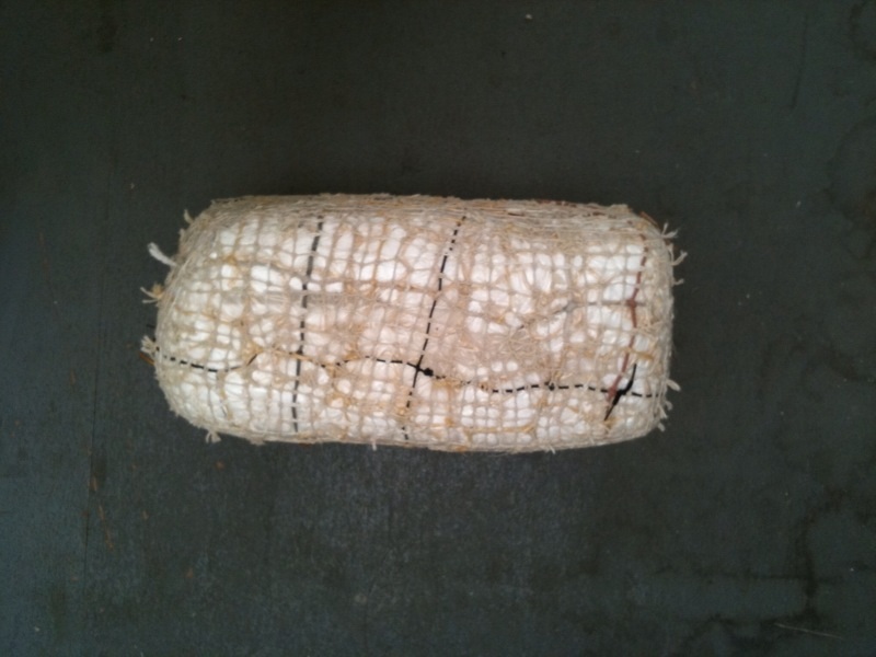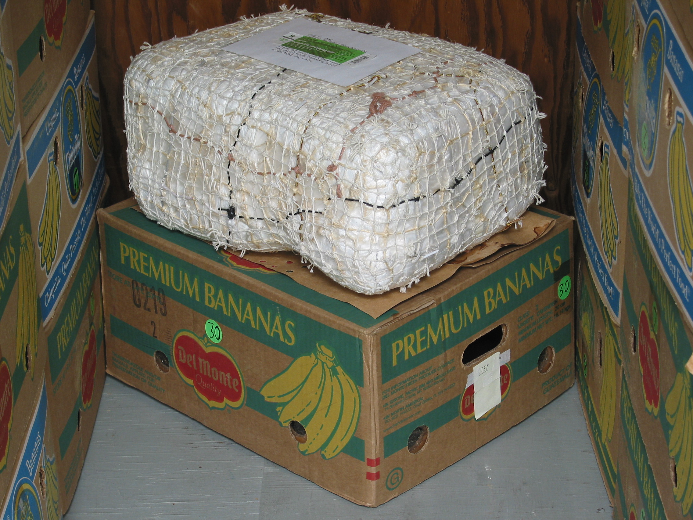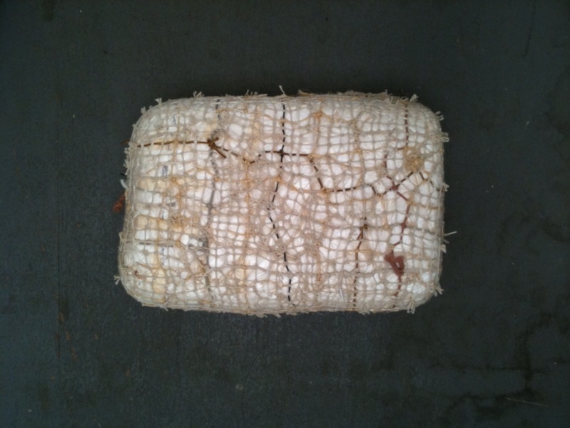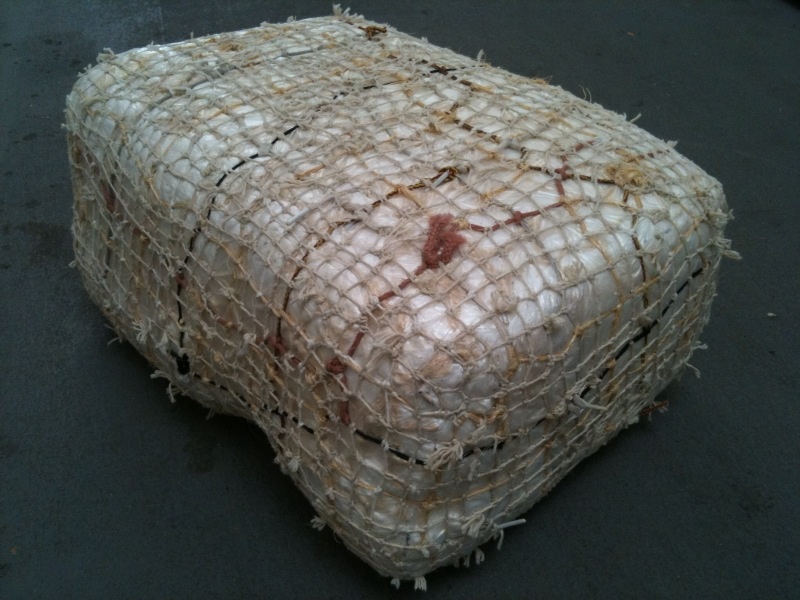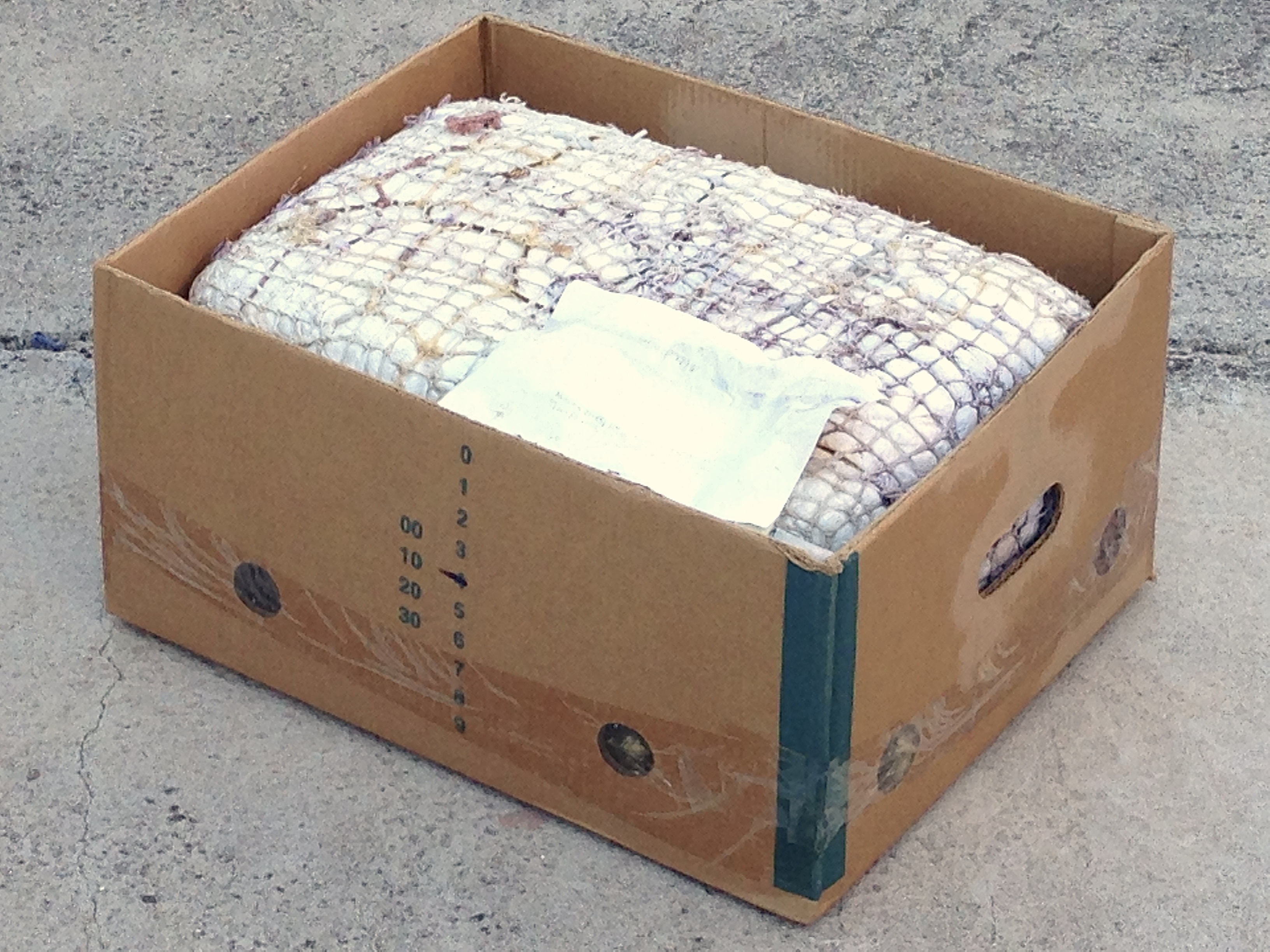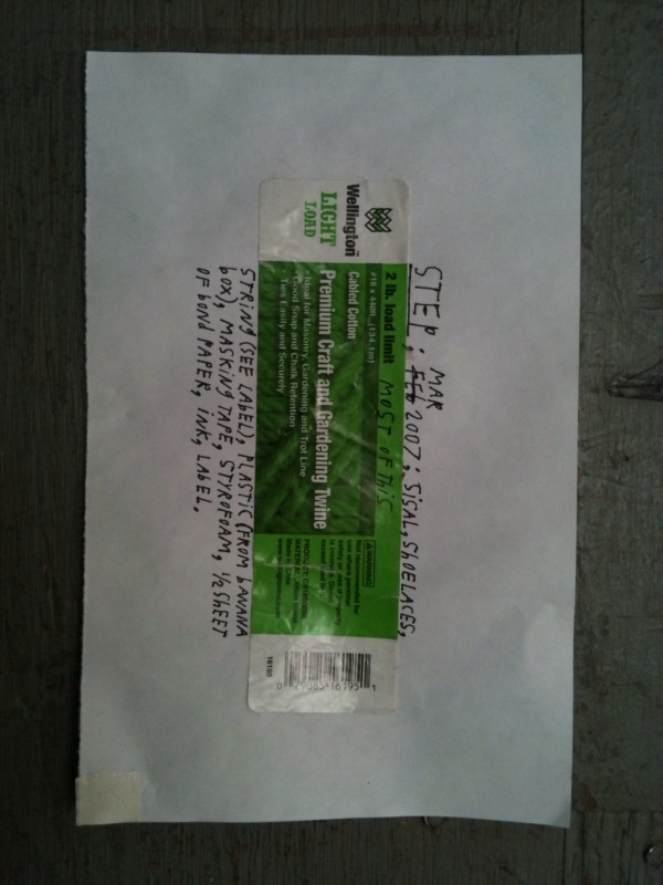 2 USED WINDSHIELD WIPERS; fall/winter2006; 2 used Bosch windshield wiper blades (metal, rubber); 1×18.5×2 inches. STEP; MAR 2007; 9″x 19″x 14″; sisal, shoelaces, string (see green label on label drawing), plastic (from banana box), masking tape, styrofoam, 1/2 sheet of bond paper, ink, label.