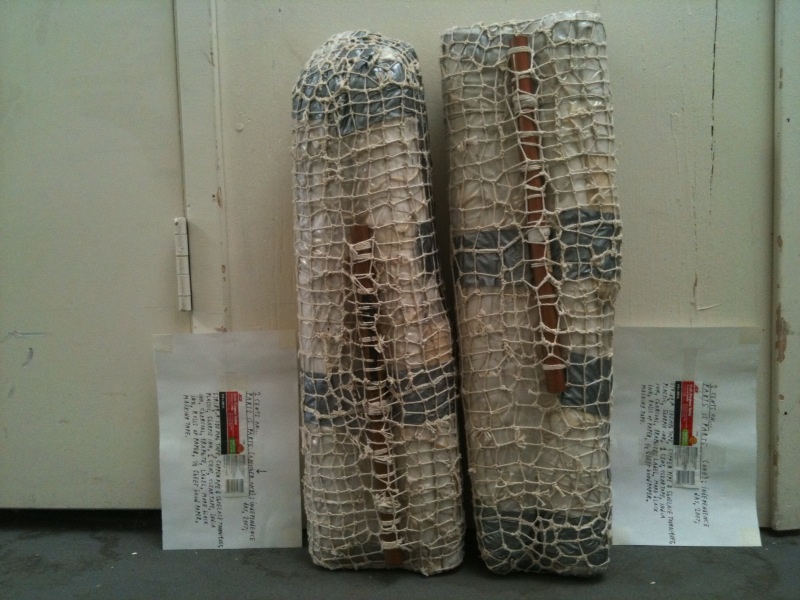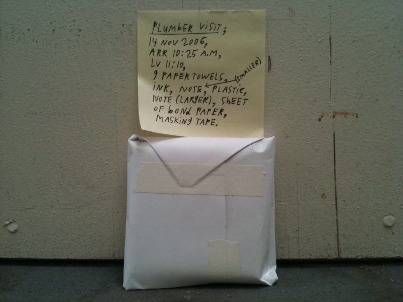 PLUMBER VISIT; 14 NOV 2006 – arrive 10:25 a.m. & leave 11:10 a.m.; 3 1/2″x 3 1/2″x 3/4″; ink, post-it note, 1 sheet of 8 1/2″x 11″ white bond paper, 9 paper towels, more ink, note (smaller), plastic, masking tape. (moved to BOX #38) DUCK, DUCK or HOOK, LINE, AND MY OWN PERSONAL SINKER; late JUL 2007; 10 1/2″x 20 1/2″x 6″; string, sisal, plastic, rope, duct tape, cardboard, jar & lid, rusted metal bolts & nuts originally intended to bolt wood framing to concrete foundation. 2 CENTS ON…PARTS IS PARTS (ONE & ANOTHER ONE); 2 parts, each one is 6″x 19 1/4″x 5 1/4″; Independence Day, 2007; string, 100 MPH tape, copper pipe & shoelace tourniquet, plastic, Sharpie ink, 1 cent, clear tape, India ink, charcoal, graphite, 2 labels, more ink, rolls of paper, 2 half sheets of bond paper, masking tape. (moved to BOX #38 and BOX #40) AH-GAH-PEY, AH-GAH-PEY, AH, AH…; tue03:59:22pm24sep2013; string, black electrical tape, found rubberized cloth glove, used car part, bronze bird sculpture (2 birds); 12x8x7in. WITH ONE 2x2x3/4-INCH NATURAL RUBBER ISO-CUBE DESIGNED TO REDUCE VIBRATION AND NOISE EMANATING FROM REFRIGERATION AND AC EQUIPMENT; wed10:07:19am27nov2013; rubber, string, elastomeric, used dental floss, upholstery thread (mastex corp style 8615 nylon bzt-18 56g nominal black 744), a cotton swab, rope, Kelly’s Cobbler professional grade water proofing black heel & sole dressing, clear tape, black tape, white tape, 14 cassettes w/plastic cases; main larger cube is 5 3/8×4 3/4×4 1/4 inches, loose string is 41 inches.