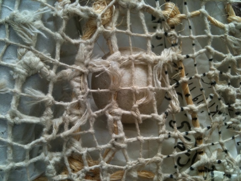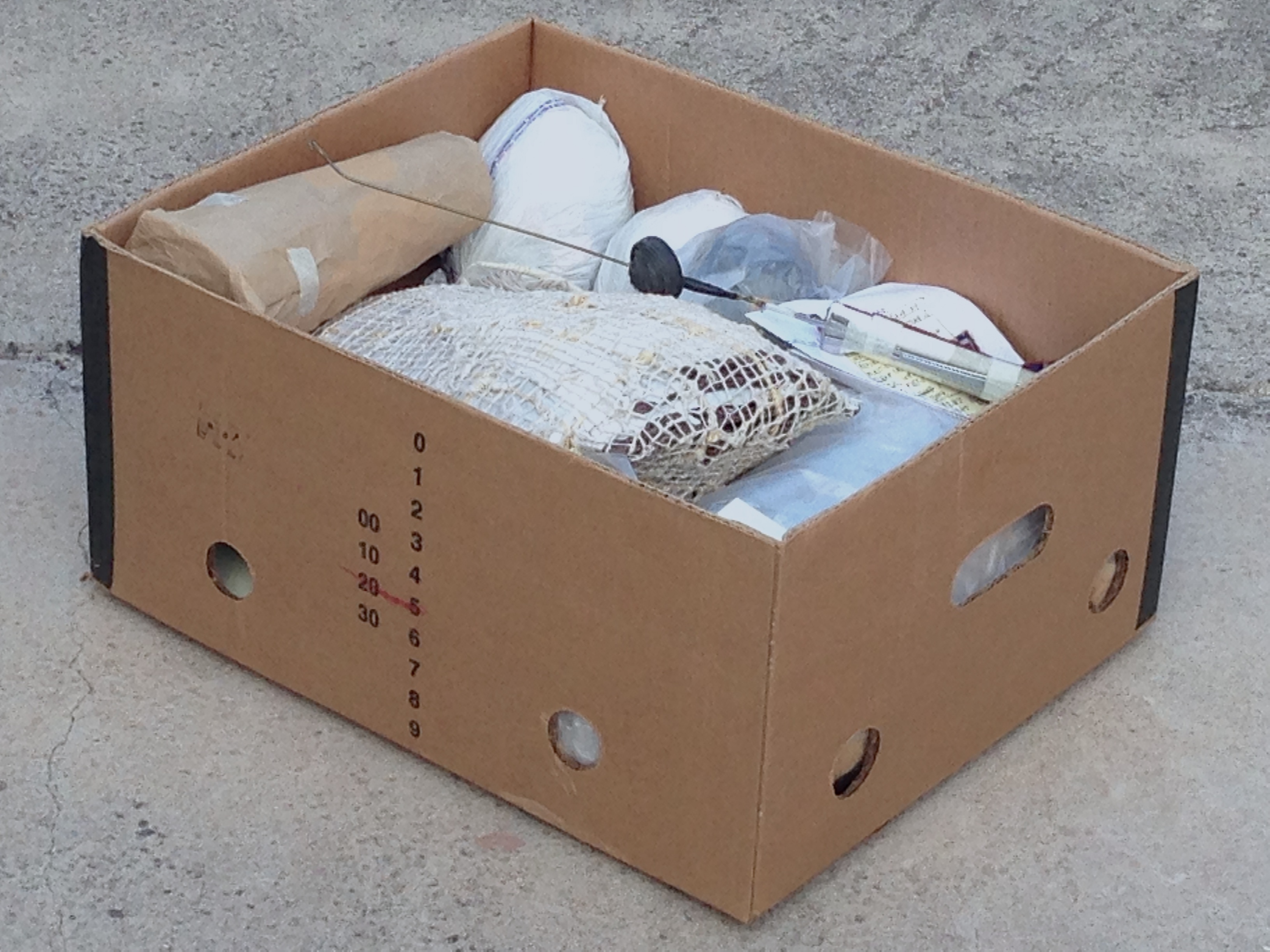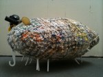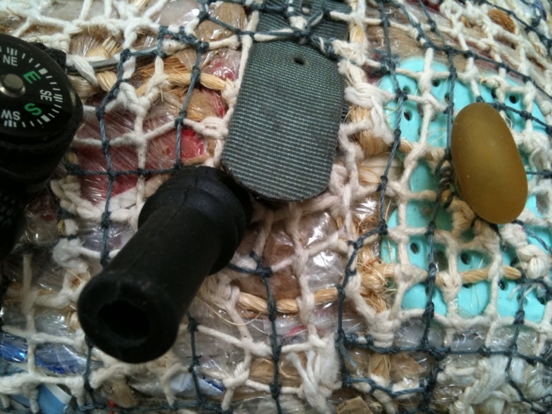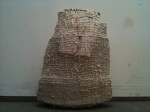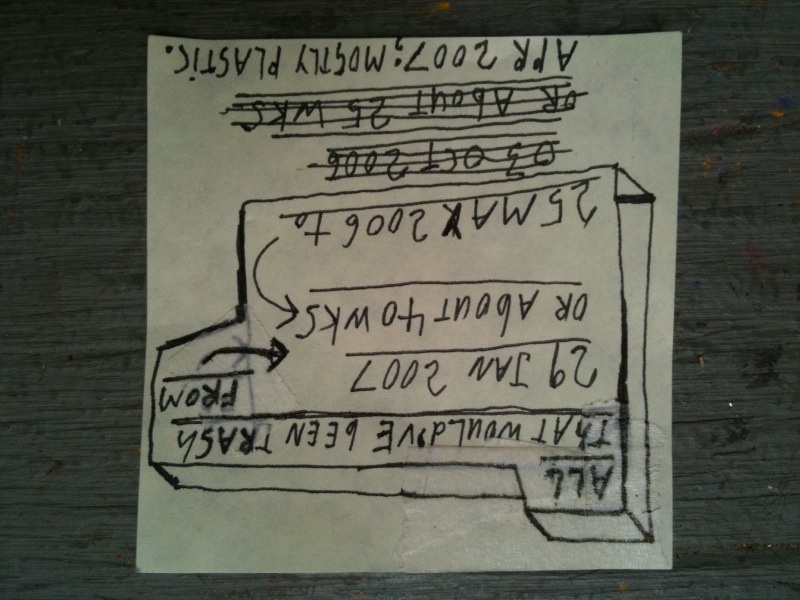 14 CUPS, 13 WRAPPERS & 1 BROWN PAPER BAG (see BOX #56) USED AUTO PARTS (see BOX #24) (FOR BOB) DRAGGER, CANYON, 1 EA. (see BOX #59) HOME-MADE DRAIN DE-CLOGGER (see BOX #33) OH CANDY OH CANDY OH (see BOX #24) ERASERS, USED, ASSORTED, HARD; sun08:51:37am01jul2012; string, erasers, traces of charcoal & graphite; 3 1/2″x3 1/2″x2 3/8″. ERASERS, KNEADED, USED; sun08:57:11am01jul2012; erasers, string, traces of charcoal & graphite; a sphere approx 3 1/4″ diameter. ALL THAT WOULD’VE BEEN TRASH FROM 25 MAY 2006 TO 29 JAN 2007 OR ABOUT 32 WEEKS; APR 2007; 6 1/2″x 13″x 8″; sisal, string, upholstery thread, mostly plastic, watchband (found), pacifier (found), compass (found), black nozzly thing (found), temporary key ring with tag, 3 plastic white pizza box supports, yellow post-it, ink. I HAVE NO USE FOR TRASH CANS, SO MINE IS NO LONGER A TRASH CAN; THU 06 SEP 2007; 16″x 6 1/2″x 13″ (main piece), 3/4″x 12 3/16″x 3/16″ (stick), 8 1/2″x 11″ (label drawing); reformed 30-gallon brown plastic trash can, paper, clear tape, masking tape, ink, white foozeball (found), sisal, string, wood stick with masking tape, bond paper, twine (string) label.