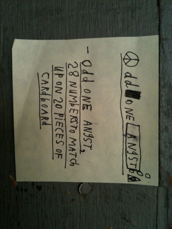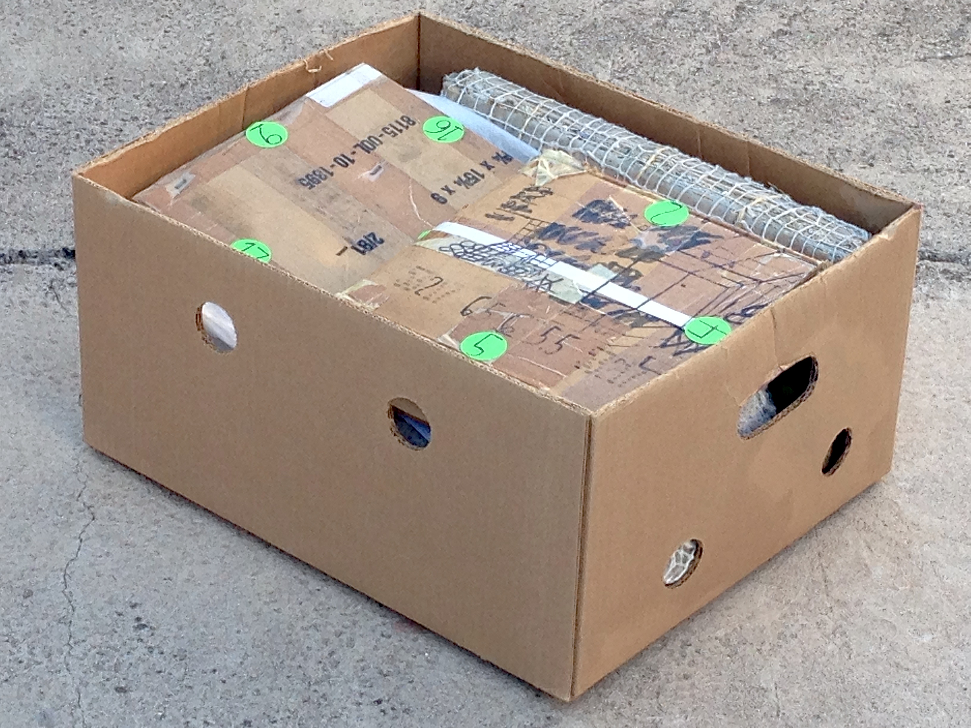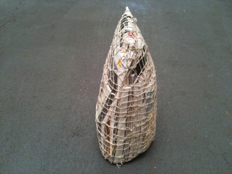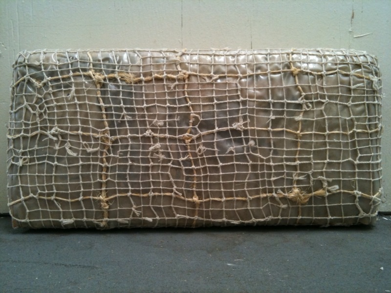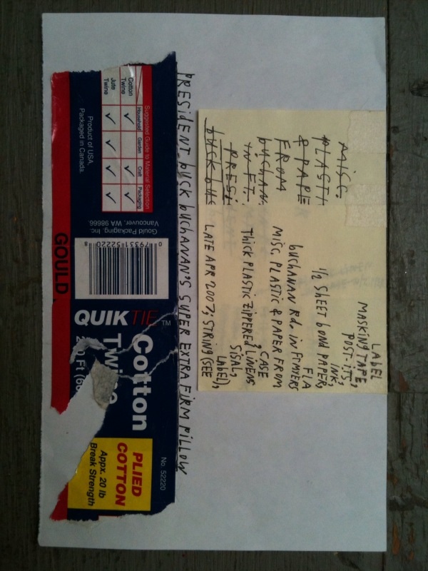 COASTER (see BOX #24) TABLE LEG FOOT TOE PIECES, 3 EA. (see BOX #21) ODD ONE ANGST; OCT 2007; condensed & stacked size is 4 3/4″x 10 1/4″x 9 3/4″, pieced together is 50 3/4″x 54 3/8″; 28 numbers to match up on 20 pieces of cardboard; cardboard box which was sent across the U.S.A. several times, tape, ink, address labels, yellow post-it, green stickers. PPPPM COVER; Summer 2005; 3″x 5 1/4″x 5 3/8″; partially painted plastic particle mask cover (with masking tape). PRESIDENT BUCK BUCHANAN’S SUPER EXTRA FIRM PILLOW; late APR 2007; 11″x 16″x 6 1/2″; sisal, string, thick plastic zippered linens cases, misc., paper and plastic from Buchanan Road in Fort Myers, FL, 1/2 sheet of bond paper, ink, post-its, masking tape, label. WEDGE; OCT 2007; 10″x 6 1/4″x 4 1/4″; string, tape, ink, photos, paper, rubberband, fragment of paper with words written by my Dad when he was still alive. TERMITES; OCT 2007; 8″x 16 3/4″x 3″; 10 or so large paintings that were painted in 1999-ish in Estero, FL, on pieced-together sheets of 8 1/2″x 11″ paper then hung on wood walls then taken down & folded & packed & moved a couple miles north to San Carlos Park & stored in a shed where termites subtractively marked them which caused me to wrap/seal them in a scrap of heavy plastic sheeting that was leftover from a large roll that I had to buy because our roof sprung a bad leak before we had to move to Sacramento, CA, where they sat in a closet off our apartment balcony…well, anyways…Spring of 2008, I used my handsaw to cut them in half so they’d fit in a banana box, sisal, string, plastic, paper, masking tape, paint. CHEW ON THIS; SEP 2007; 3 1/8″x 6 1/4″x 4 3/8″; 2 sculpturettes made in San Carlos Park, FL, from leftover cement & plaster from home repairs, surrounded by a found rawhide dog chew which I soaked in water then wrapped around and bound in string; cement, plaster, rawhide, string.