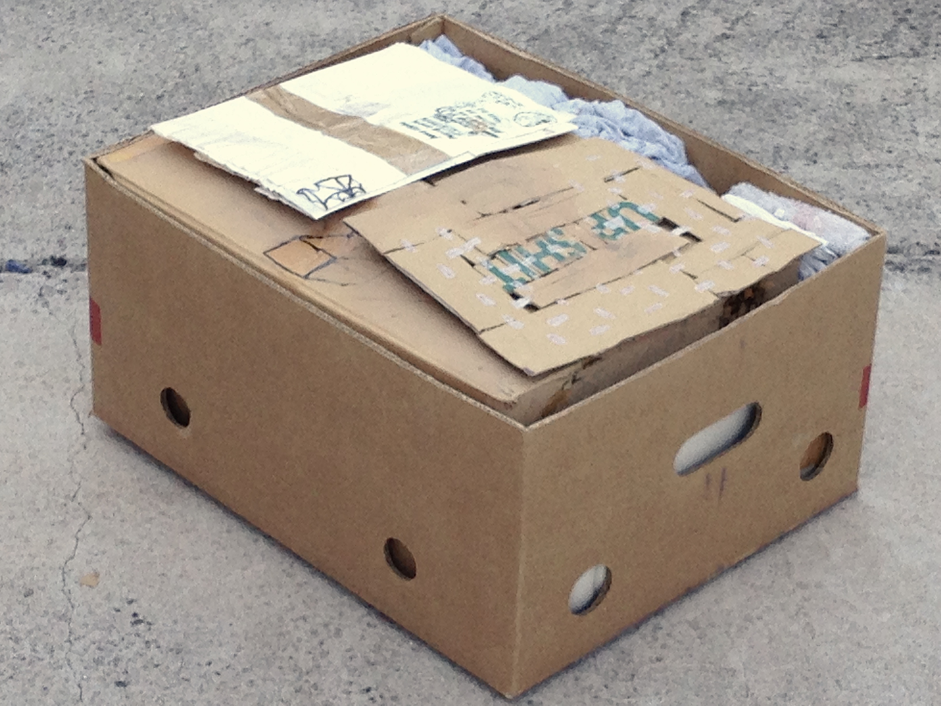 PADDLEHEAD (2 PARTS); Thu 4:38:37pm 26MAY2011; 2-d is paper, tape, ink and is 16×21 inches & the 3-d is string, tape, wood, metal and is 12 1/4 x 5 x 2 inches. 4 KEPT FRAGMENTS AND A MEMO; sun11:55:05am 03apr2011; rubber, tape, cardboard, foam rubber, paper, ink, plastic, styrofoam, ceramic; 4 fragments of artworks (that were traded for 3 artworks) and a custom-made box; approx 5×6.25×2.75 inches (closed)…the 4 fragments are from 2 OF 3 FOAM PIECES FROM A GIFT PACK OF PEARS (in BOX #1), BROKEN YELLOW PLATE WITH FRAGMENT MISSING (in BOX #14), I ORDERED A BEAN & CHEESE BURRITO…WITH PLATE TAPE INK FORK FRAGMENTS MISSING (in BOX#19), J.CREW CATALOG WITH PAGE 15/16 MISSING (in BOX #55). RECEIPT, ESTATE SALE PURCHASE – HAMMER & PLIERS (see BOX #61) ROBERT’S BUSINESS CARD & ON-THE-SPOT RESTAURANT POEM SUN13NOV2011 (see BOX #61) ANY TITLE USING THE LETTERS H,I,P,S,T,U WITH NEARLY 150 ARROWS (see BOX #56) RE:ICAN’TSELLMYARTWORK (see BOX #56) 3 DIRTY HANDKERCHIE(F)S (see BOX #55) 2 HAND TOWELS (see BOX #55) A WORN OUT GRAY T-SHIRT (see BOX #55) 5 PLASTIC HANGERS (see BOX #55) UNDISCLOSED CHUNK; spring2003; disregarding sisal, string, upholstery thread, plastic trash bag, cardboard box, clear tape, ink – the remaining materials and source of those materials will remain undisclosed; 9.5x12x8 inches.