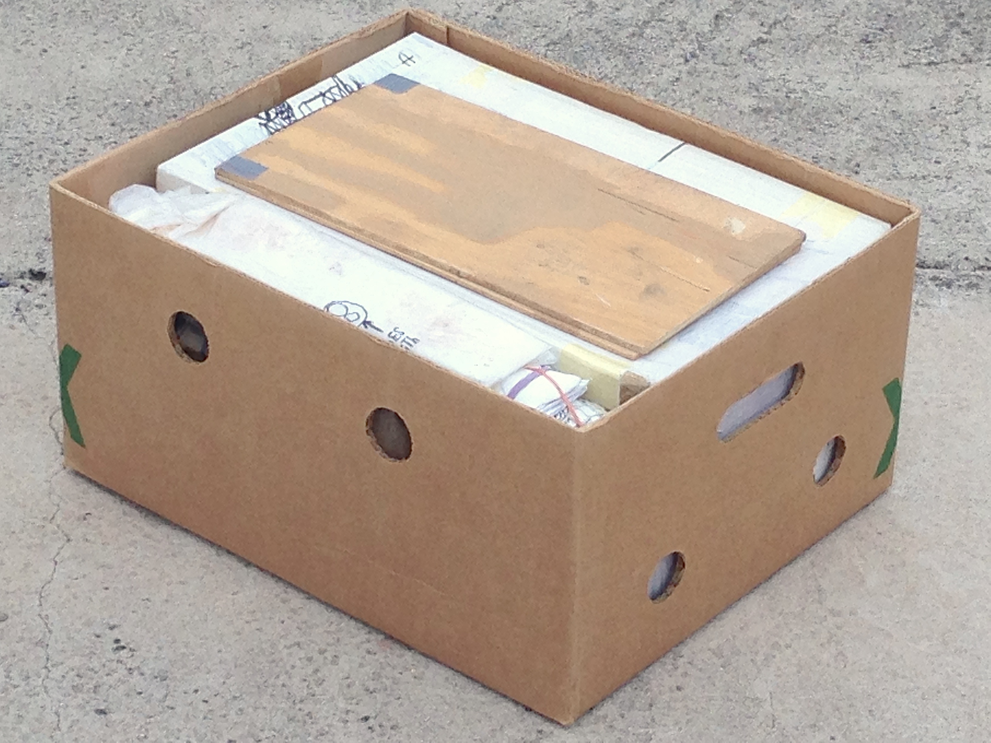 63 FROM TACO BELL & 1 FROM CARL’S JR; tue06:49:13pm24mar2011; 63 burrito wrappers, 192 used hot sauce packets, 64 receipts, a white paper bag, masking tape, ink; 6.5×5.5×4.5 inches. MR PALMER, THE $5 POEM, AND THE MOTEL 6; fri05:01:35pm17sep2010; rubberbands, paper, tape, ink, misc; approx 5x4x3 inches. ?3 CATALOGS, INK (see BOX #56) ? 2 PIECES OF WOOD & 4 PIECES OF TAPE & SOME PAINT MARKS; thu05:5843pm26may2011; wood, tape, paint; 15x8x.5 inches (closed), 30x8x.25 inches (open, flat). VENT-U-RAH; spring2005; wood, plastic, tape, post-it, ink, nails; a townhouse was purchased in Albuquerque, New Mexico, USA, final inspection showed garage door did not seal properly, sellers attempted fix with a new weather strip, It broke when they closed the garage door, though broken they left it attached, I detached it, cut it up, packed it into a frame made from scrap wood, and use it to vent-u-rah; 3×13.75×7.5 inches. WHAT DID YOU EAT UNDER THERE? (BOX 1 OF 2); thu03:39:41pm24jun2004; used briefs, used boxers, used undershirts, 1/2 dozen used Gap t-shirts (bound), used handkerchiefs, used washcloths, 2 rubber masks, rags, 3 (4?) cardboard boxes, plastic, paper, towels, marker ink, sisal, used hat, tape; approx 9x12x18 inches. V.I.P. Q&A (9Q’S&1AJAX W/FOLDER); sat08:35:00pm25jul2015; paper, ink, used tape, dried blood (cover is cardboard, ink, paint, tape, graphite, 3 stickers, 1 metal clip; 13.5×8.5x.5to1 inches (closed).